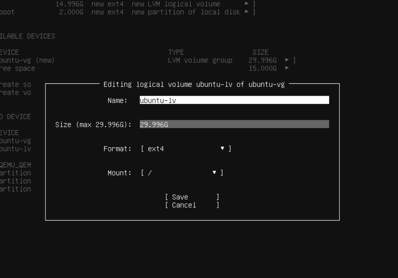 Make sure you configure the installer to use all the disk space available. Usually I would make more mount points for a Linux Server, but since it will just run a Kubernetes cluster in my homelab, I don't deem it too necessary. Mount points / and /boot are fine.