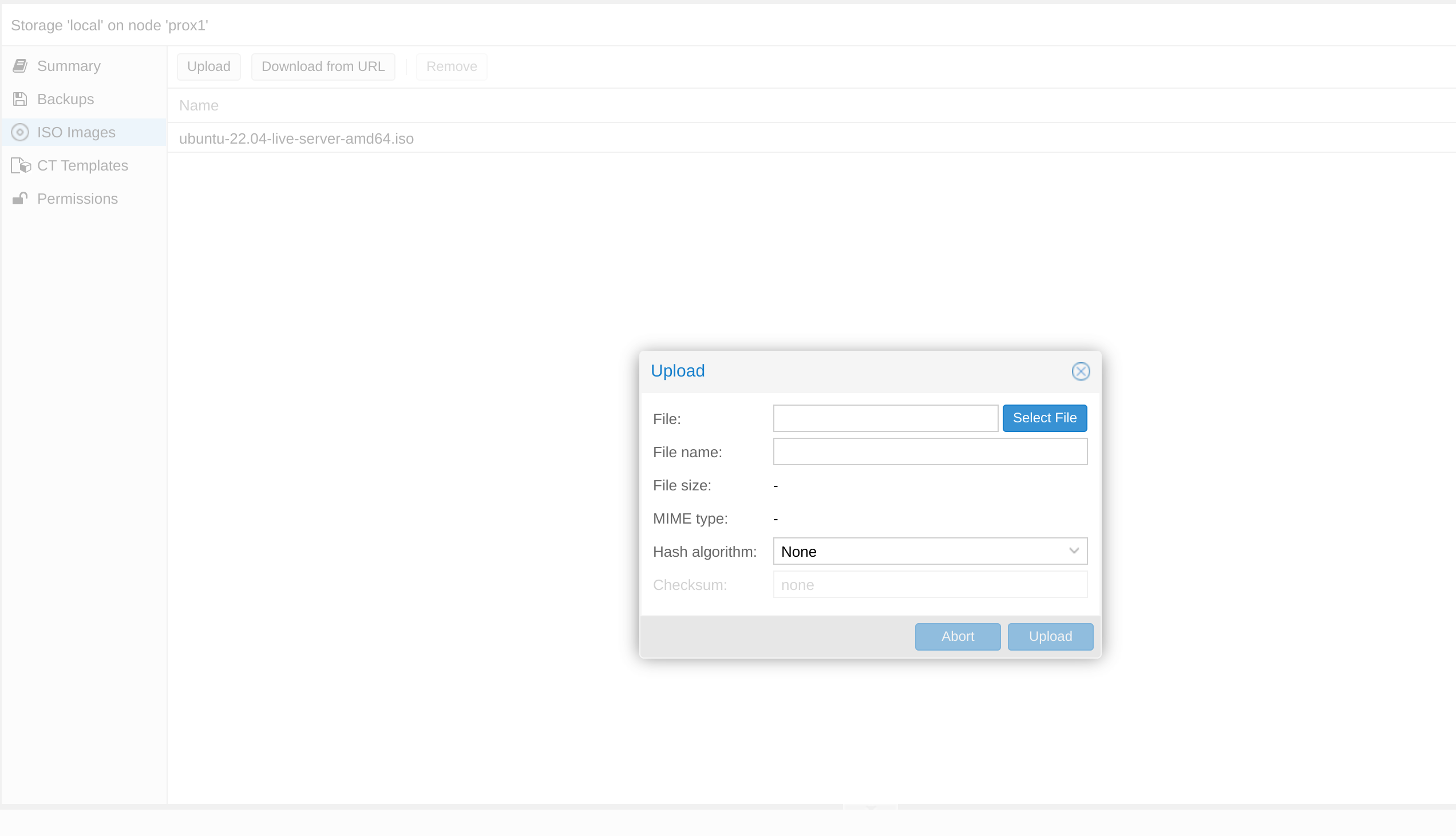 We start by downloading the Ubuntu22.04 image and uploading it to Proxmox (or whichever hypervisor you are using).
