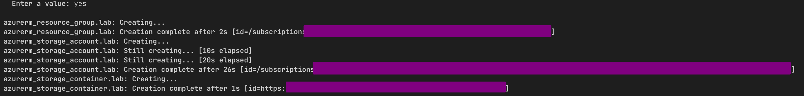 hclmain.tfterraform {required_providers {azurerm = {source = "hashicorp/azurerm"version = "3.30.0"}}}provider "azurerm" {features {}skip_provider_registration = true}resource "azurerm_resource_group" "lab" {name = var.resource_group_namelocation = var.azure_region}resource "azurerm_storage_account" "lab" {name = var.azurerm_storage_account_nameresource_group_name = azurerm_resource_group.lab.namelocation = azurerm_resource_group.lab.locationaccount_tier = "Standard"account_replication_type = "LRS"}resource "azurerm_storage_container" "lab" {name = var.azurerm_storage_container_namestorage_account_name = azurerm_storage_account.lab.namecontainer_access_type = "private"}data "azurerm_client_config" "current" {}resource "azurerm_role_assignment" "lab" {scope = azurerm_storage_account.lab.idrole_definition_name = "Storage Blob Data Contributor"principal_id = data.azurerm_client_config.current.object_id}