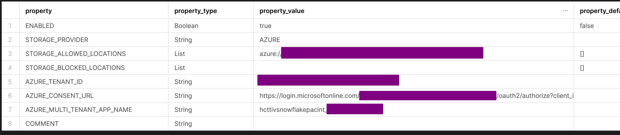 You can specifically limit the paths with STORAGE_ALLOWED_LOCATIONS or block paths with STORAGE_BLOCKED_LOCATIONS. Here use URL from the storage container (that we got from terraform) with azure:// as prefix.