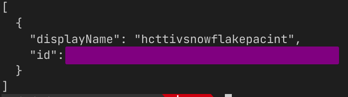 bashaz ad sp list --display-name "hcttivsnowflakepacint" --query "[].{displayName:displayName, id:id}"