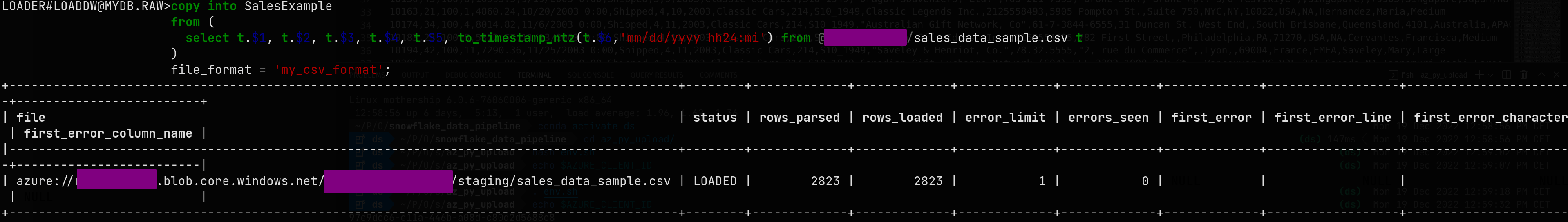 sql-- Create the target tablecreate or replace table SalesExample (ORDERNUMBER int,QUANTITYORDERED decimal,PRICEEACH decimal,ORDERLINENUMBER int,SALES decimal,ORDERDATE timestamp_ntz);-- Convert the staged CSV column data to the specified data types before loading it into the destination tablecopy into SalesExamplefrom (select t.$1, t.$2, t.$3, t.$4, t.$5, to_timestamp_ntz(t.$6,'mm/dd/yyyy hh24:mi') from @azure_stage/sales_data_sample.csv t)file_format = 'my_csv_format';